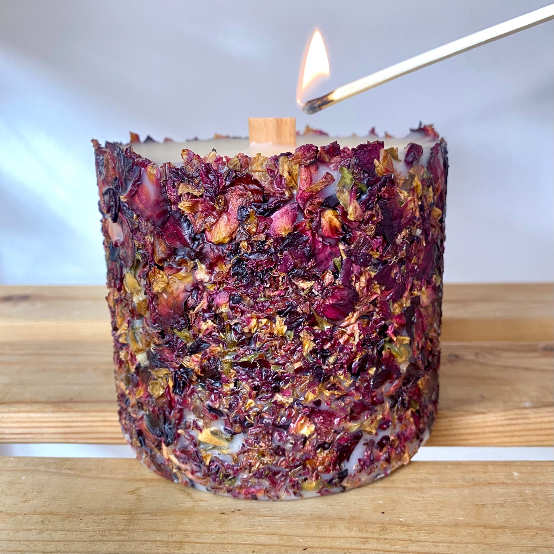 נר ריחני יצוק בעבודת יד. מכיל שעוות דבורים, פתיל עץ, ורדים ותמציות שמנים אתרים בניחוח פטשולי, לבנדר וניל.